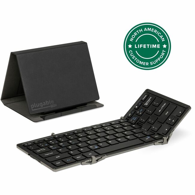 | Marketing Information | A Keyboard for Your Phone or Tablet The Plugable Folding Bluetooth Keyboard BT-KEY3XL is small convenient and easy to use with any phone or tablet. Whether you're texting sending emails or writing a report this keyboard is great for planes coffee shops and more! Yet when you are ready to go it folds smaller than a paperback book and fits right in a bag or briefcase with your tablet or phone. Portable Experience the ease of typing on a keyboard while away from your desk. The normal-size keys are properly spaced for accurate typing and have a crisp and familiar touch with the precise scissor switch mechanism found on quality desktop and laptop keyboards. Charging Minutes of charging give you hours of use! Plug the keyboard into a USB charger or computer. Check on the keyboard's charge level by pressing Fn + Right Alt. The power LED indicates the battery level from 4 flashes (full) to 1 flash (needs charging). Use the Case as a Stand The included case protects your keyboard when stowed then a quick flip of the cover turns it into an adjustable stand for your phone or tablet. The fitted case is lined with soft microfiber on the inside to protect the keyboard with a soft leather-like surface on the outside. Compatibility The Plugable keyboard connects via both Bluetooth and USB. It features USB charging and compatibility modes for iOS Android and Windows. A row of dedicated special keys and quick two-finger key combos give you lots of control over your devices such as: